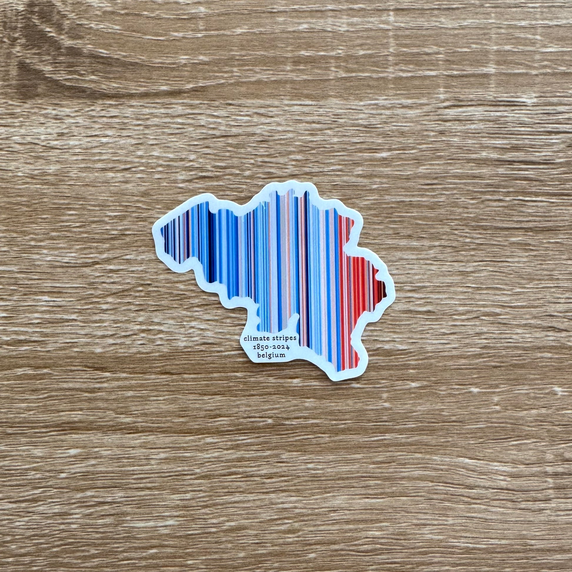 Bring climate data to life with this striking sticker featuring the iconic warming stripes by Ed Hawkins, transformed into the shape of Belgium. Displaying annual average temperatures in Belgium from 1850 to 2024, it blends powerful science with beautiful art to spark conversation and awareness. Perfect for laptops, water bottles, or notebooks—this piece makes a bold statement about our changing climate. 🌍