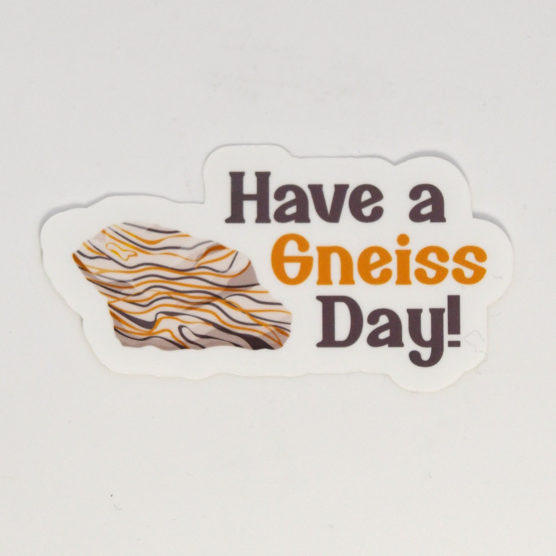 Rock your sense of humour with this punny sticker: “Have a gneiss day!” Perfect for geologists, earth science fans, or anyone who loves a clever wordplay—stick it on your laptop, notebook, or water bottle for a smile that’s truly stone-cold awesome! 🪨😊
